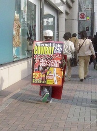 サンドイッチマン(サンドウィッチマン、英:sandwich man)とは、広告宣伝手法の一つで、人の胴の前面と背中の両方に宣伝用の看板(サンドイッチ・ボード)を取り付け、町中にたたずみ、あるいは歩行する広告手法、およびその看板を取り付けられた人のことをいう。 人間広告塔の形態のひとつである。 Wikipedia (JA)